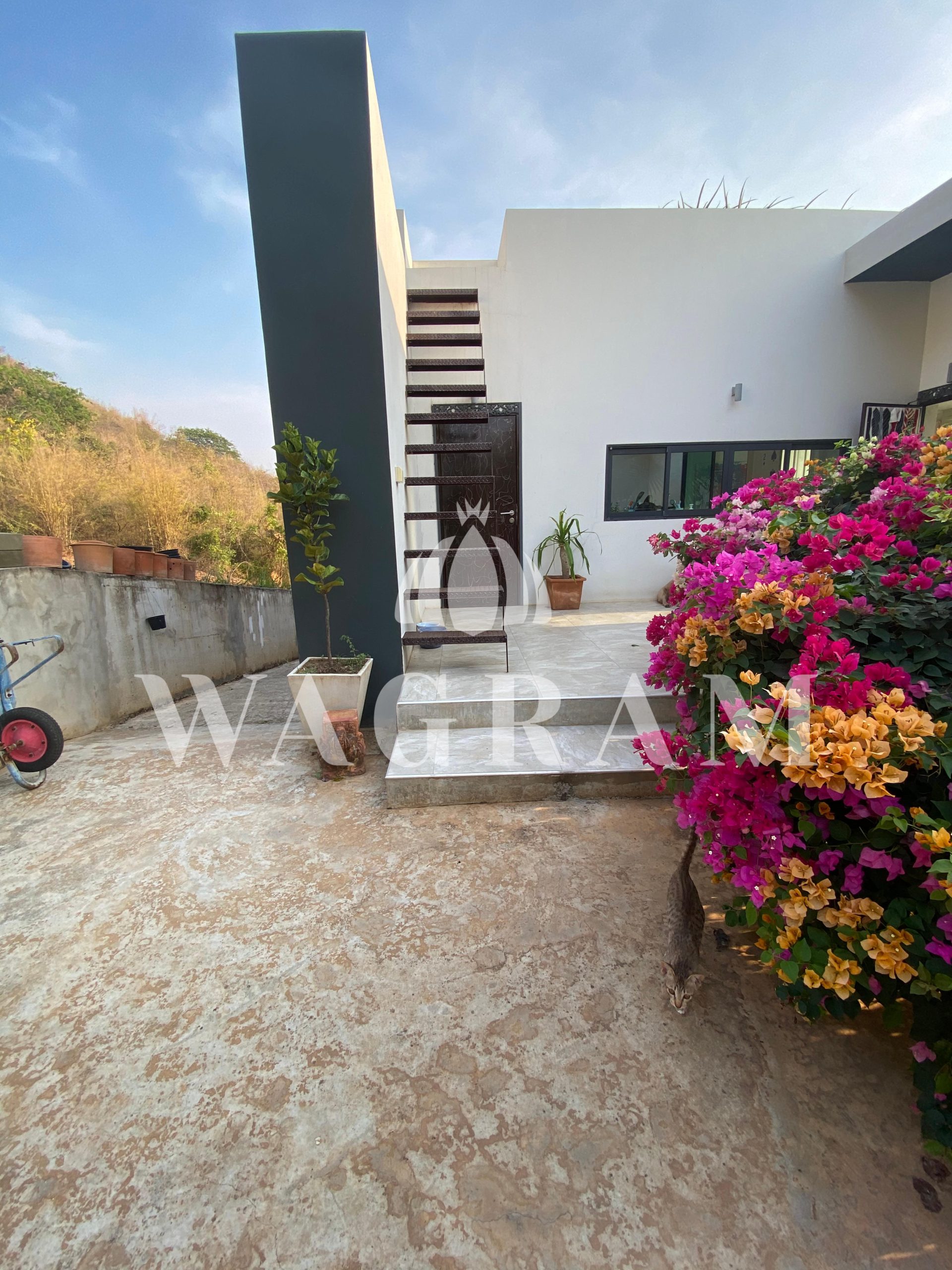 After the parking, a stone pathway leads to an open patio & kitchen area, direct access to the pantry next to kitchen. On the other side is a fully equipped guest room with its own kitchen, bathroom, living room and terrace.