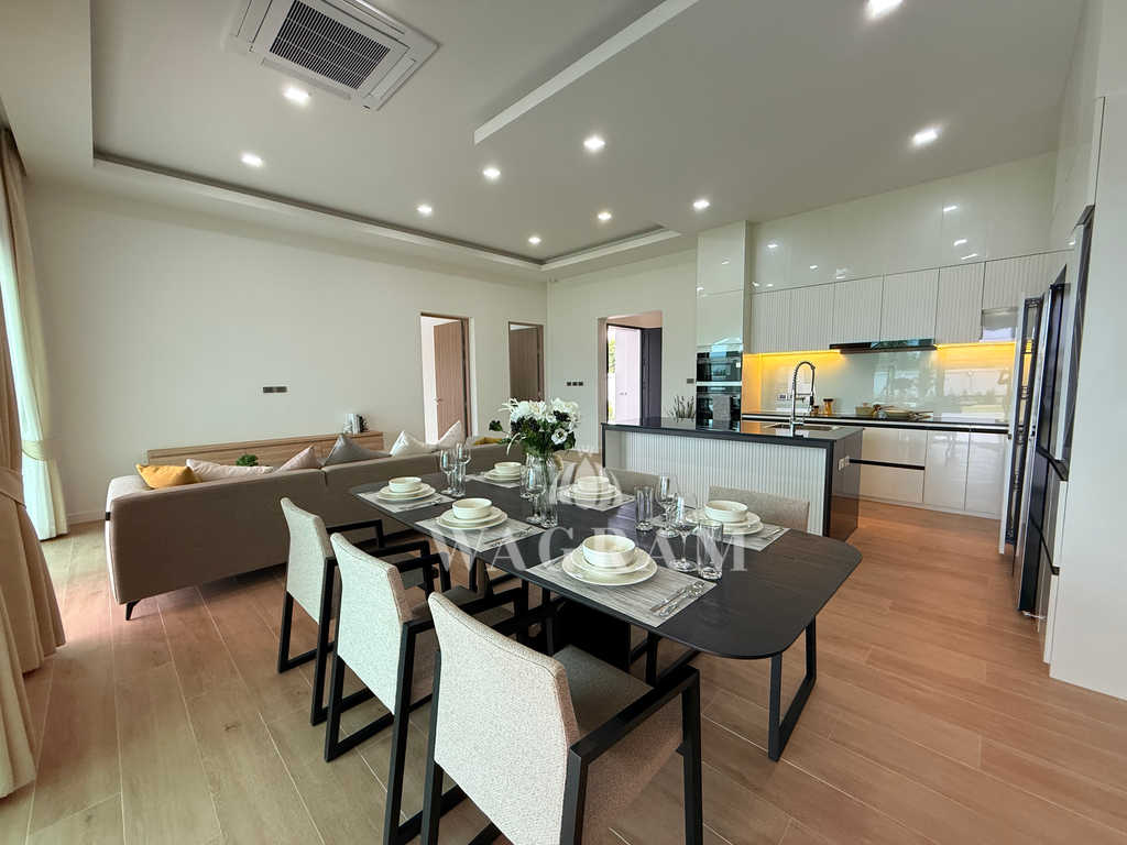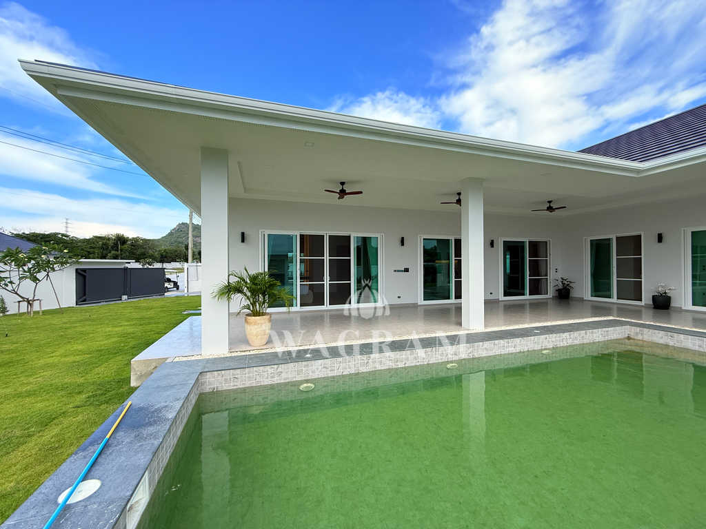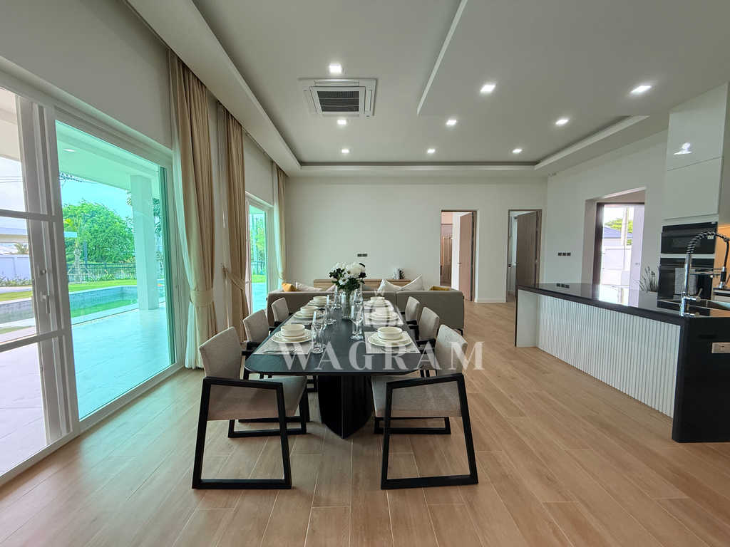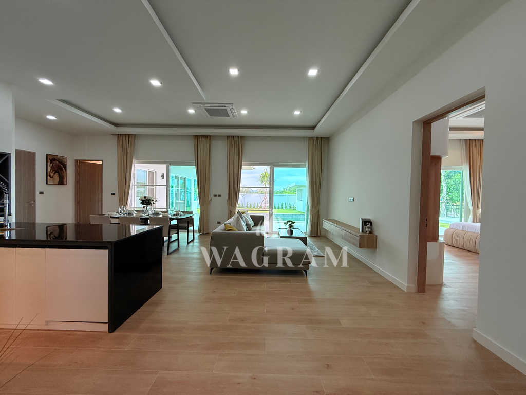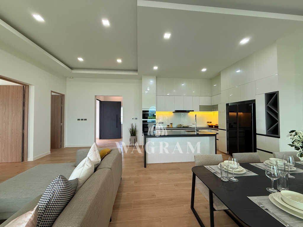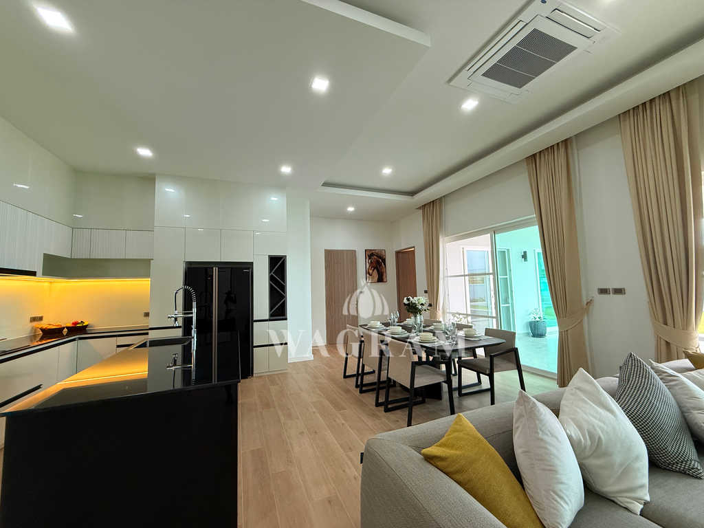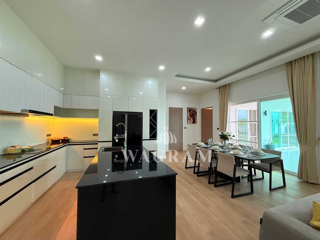 Pool villa OFF-plan and under construction Nestled amidst serene surroundings, this newly constructed villa in Hua Hin offers a peaceful and serene environment, enveloped by mountains and lush nature. Its modern Muji-style design emphasizes simplicity and a clean aesthetic, creating a tranquil atmosphere.spacious lounge areas and a fully fitted European-style kitchen.
