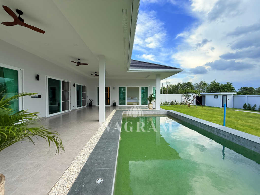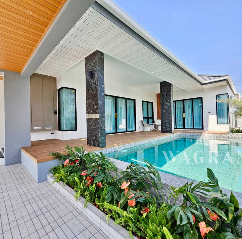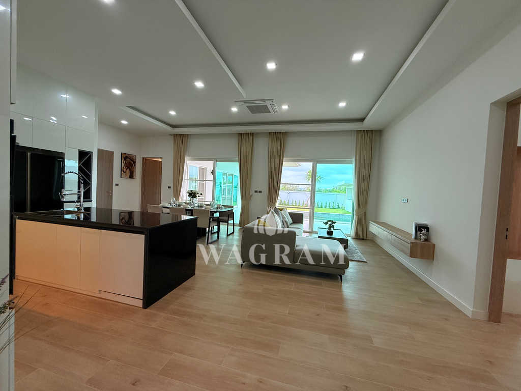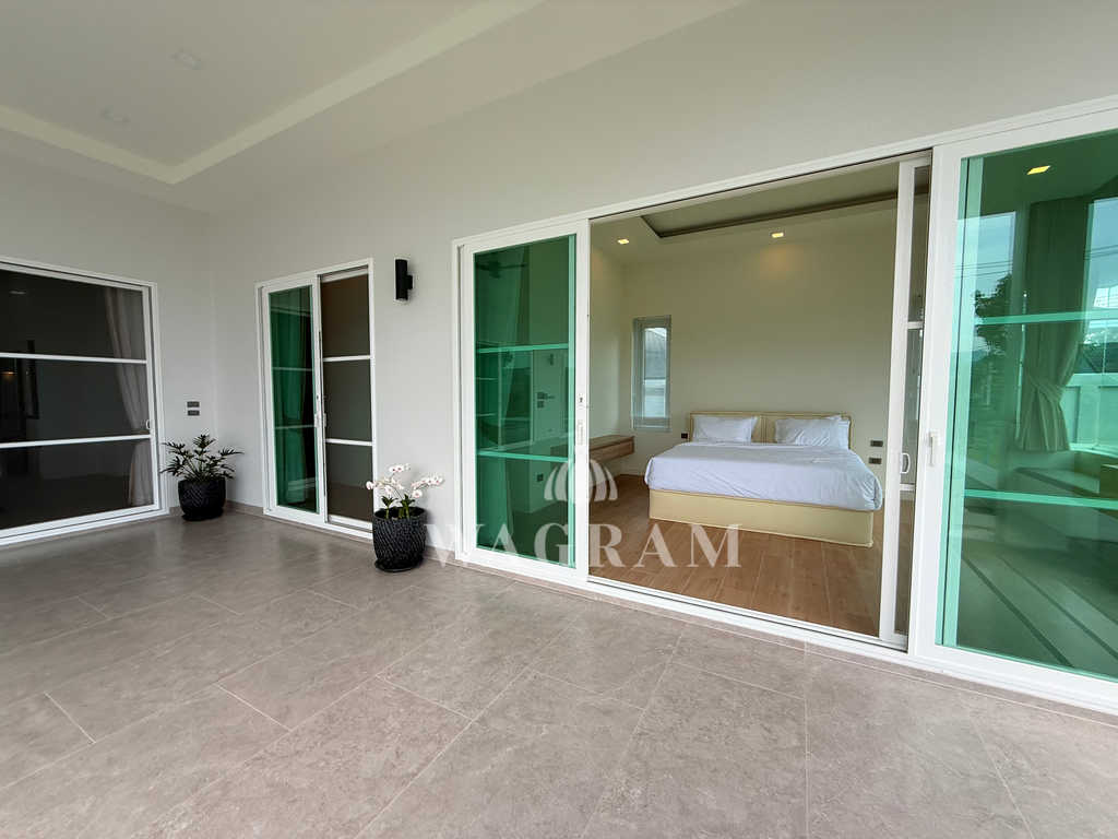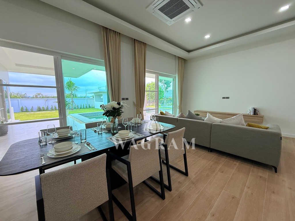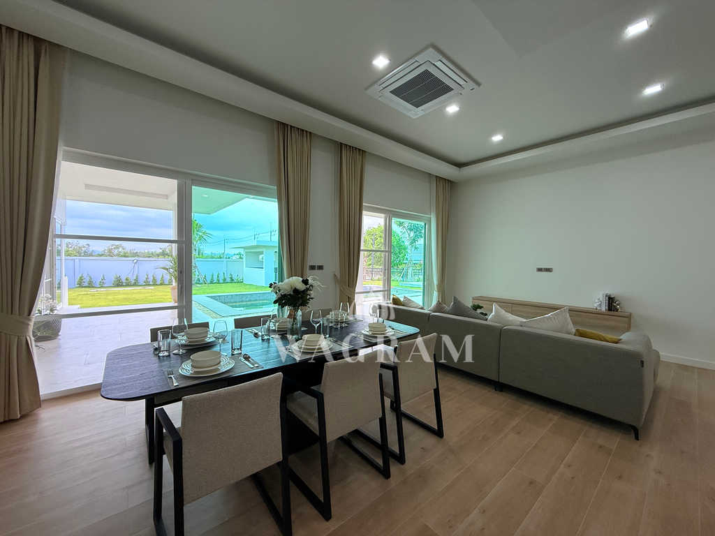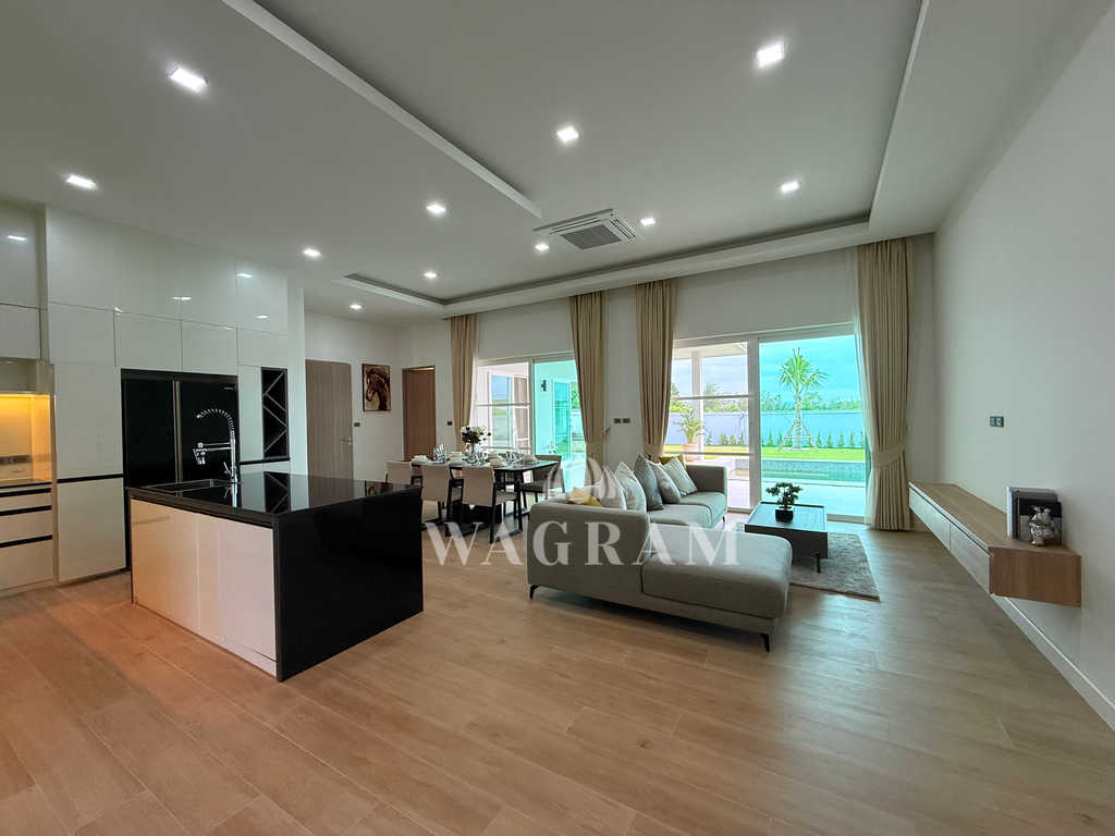 Pool villa OFF-plan and under construction Nestled amidst serene surroundings, this newly constructed villa in Hua Hin offers a peaceful and serene environment, enveloped by mountains and lush nature. Its modern Muji-style design emphasizes simplicity and a clean aesthetic, creating a tranquil atmosphere.spacious lounge areas and a fully fitted European-style kitchen.