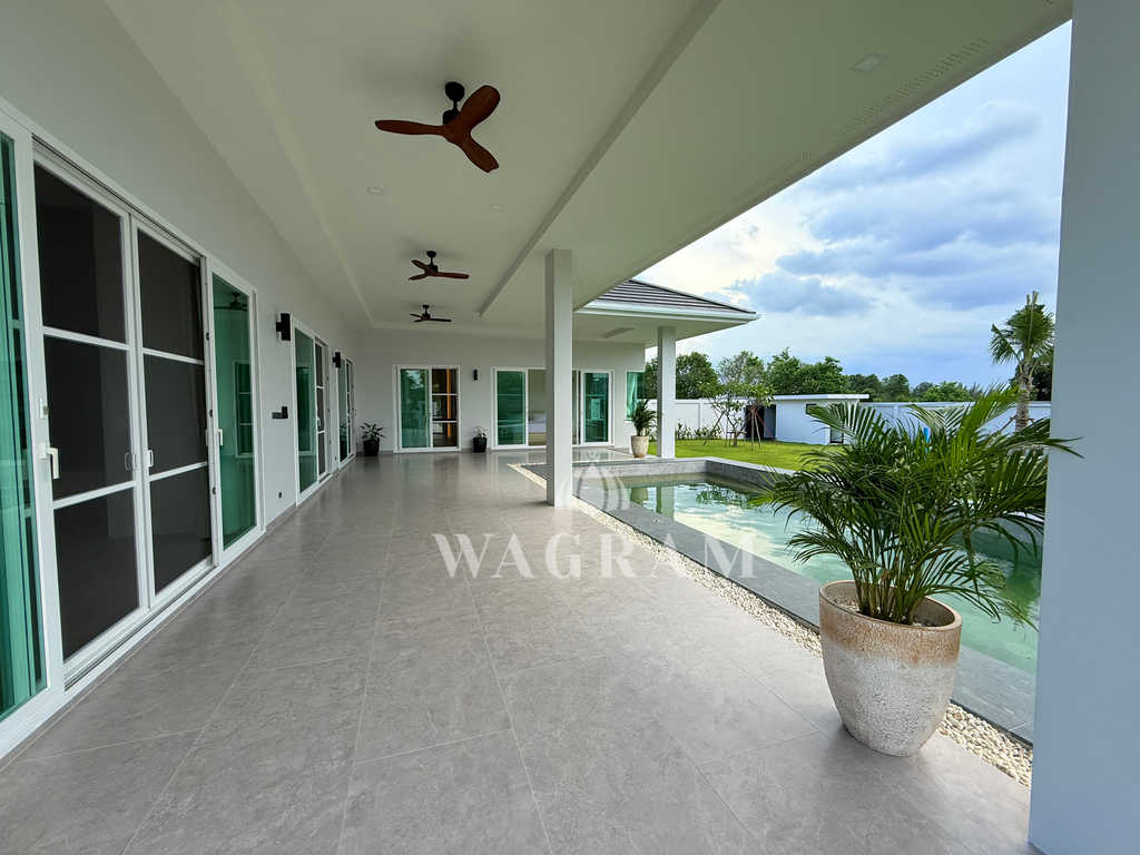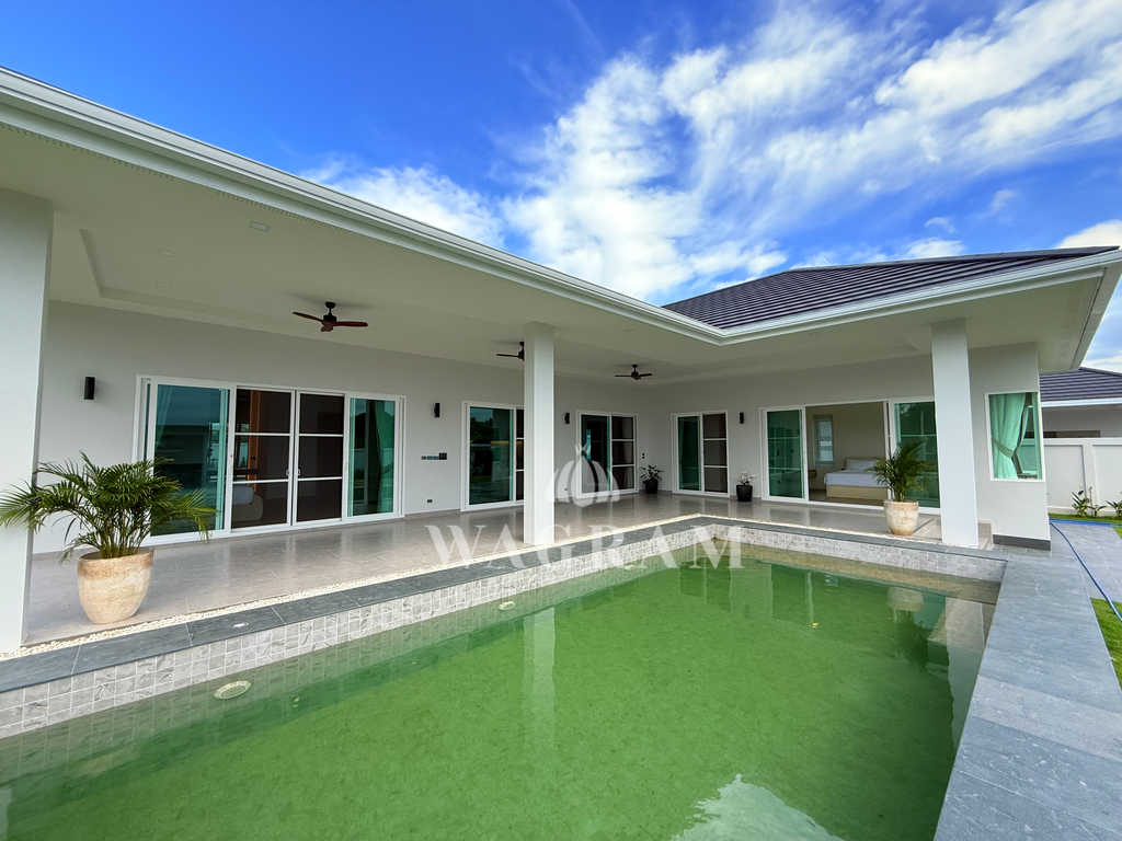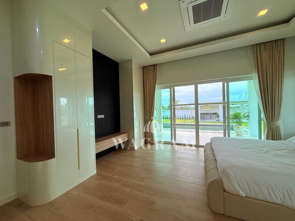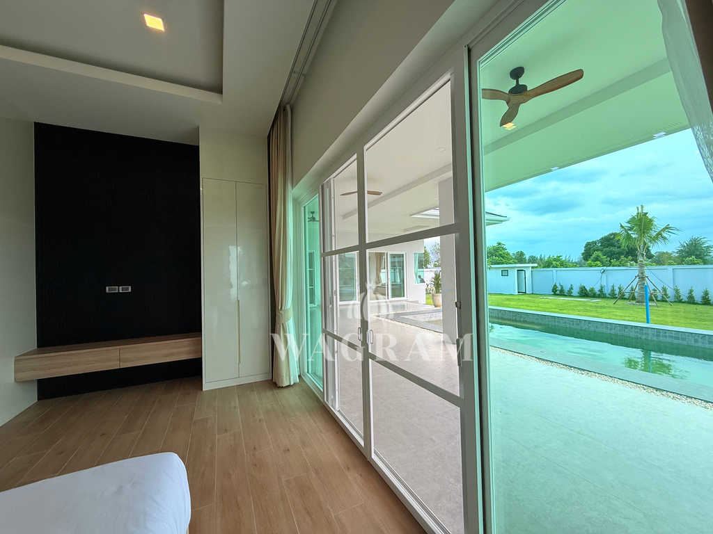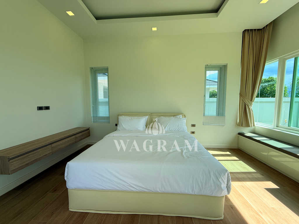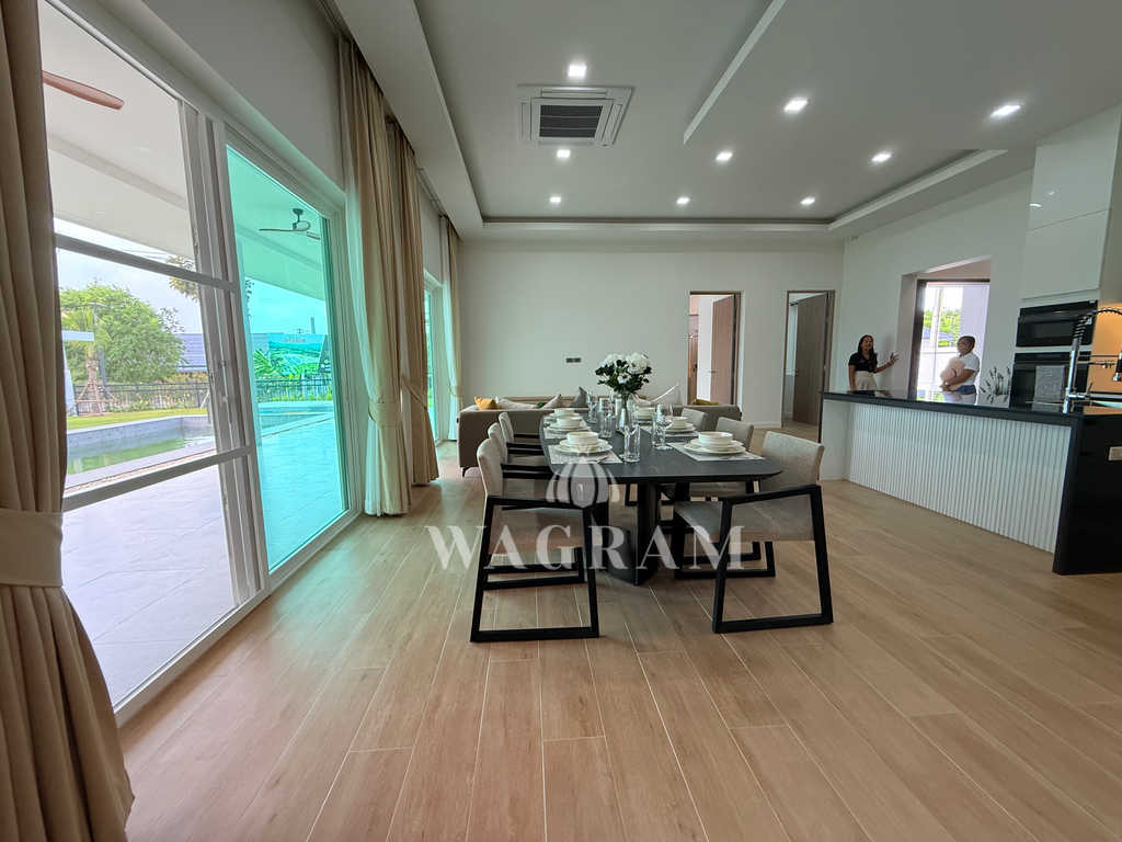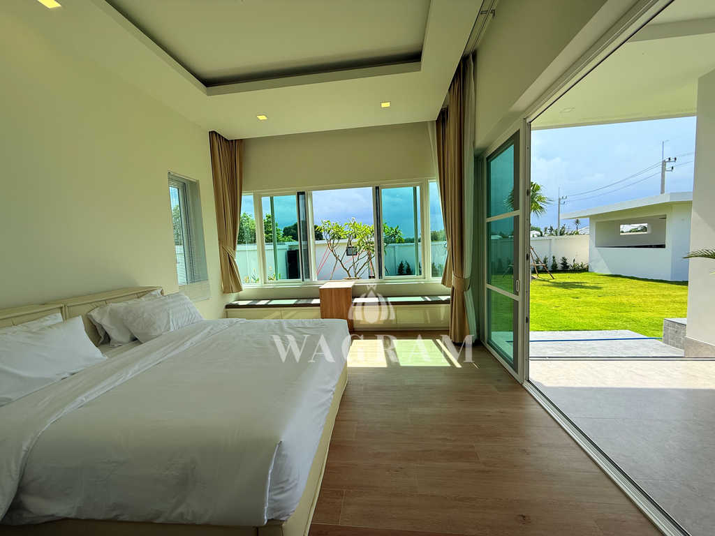 Pool villa OFF-plan and under construction Nestled amidst serene surroundings, this newly constructed villa in Hua Hin offers a peaceful and serene environment, enveloped by mountains and lush nature. Its modern Muji-style design emphasizes simplicity and a clean aesthetic, creating a tranquil atmosphere.spacious lounge areas and a fully fitted European-style kitchen.