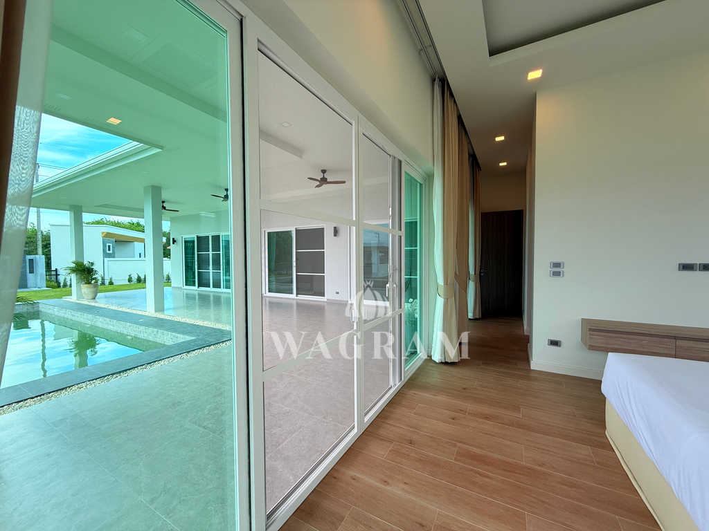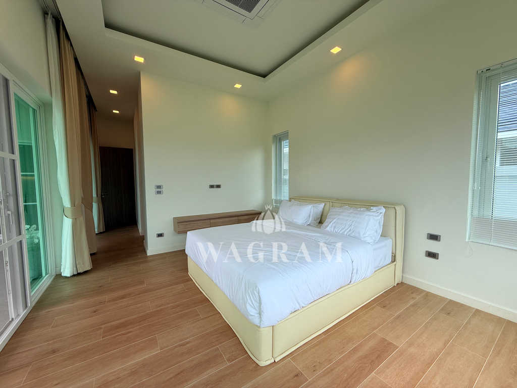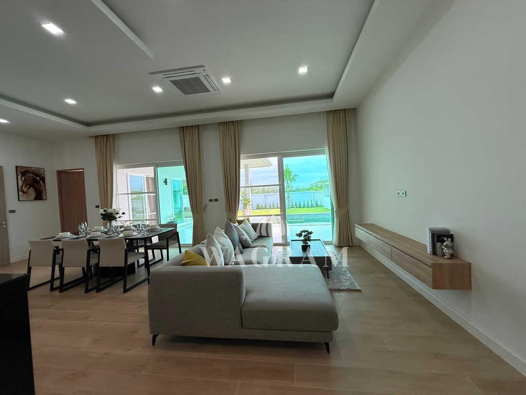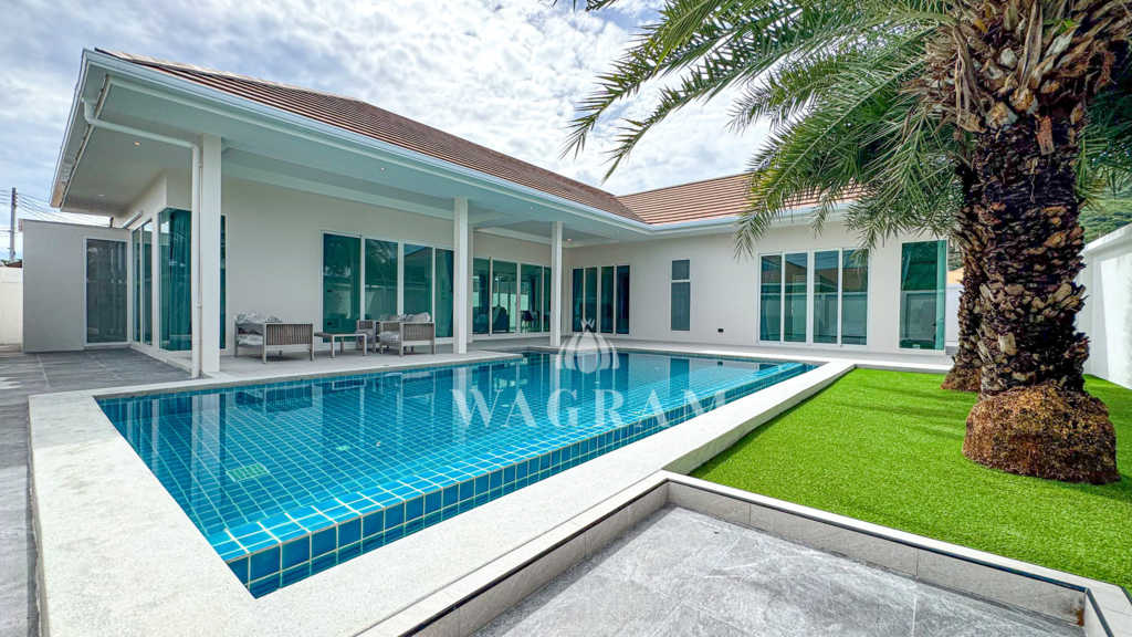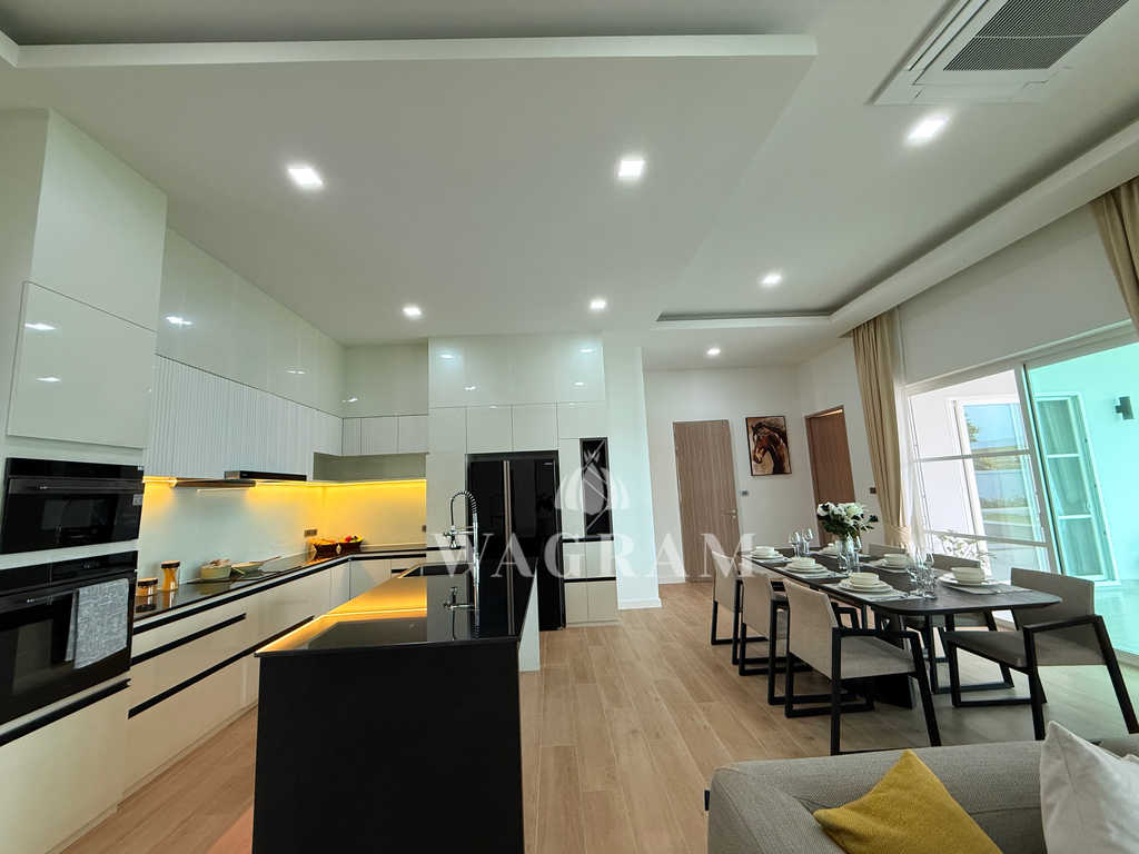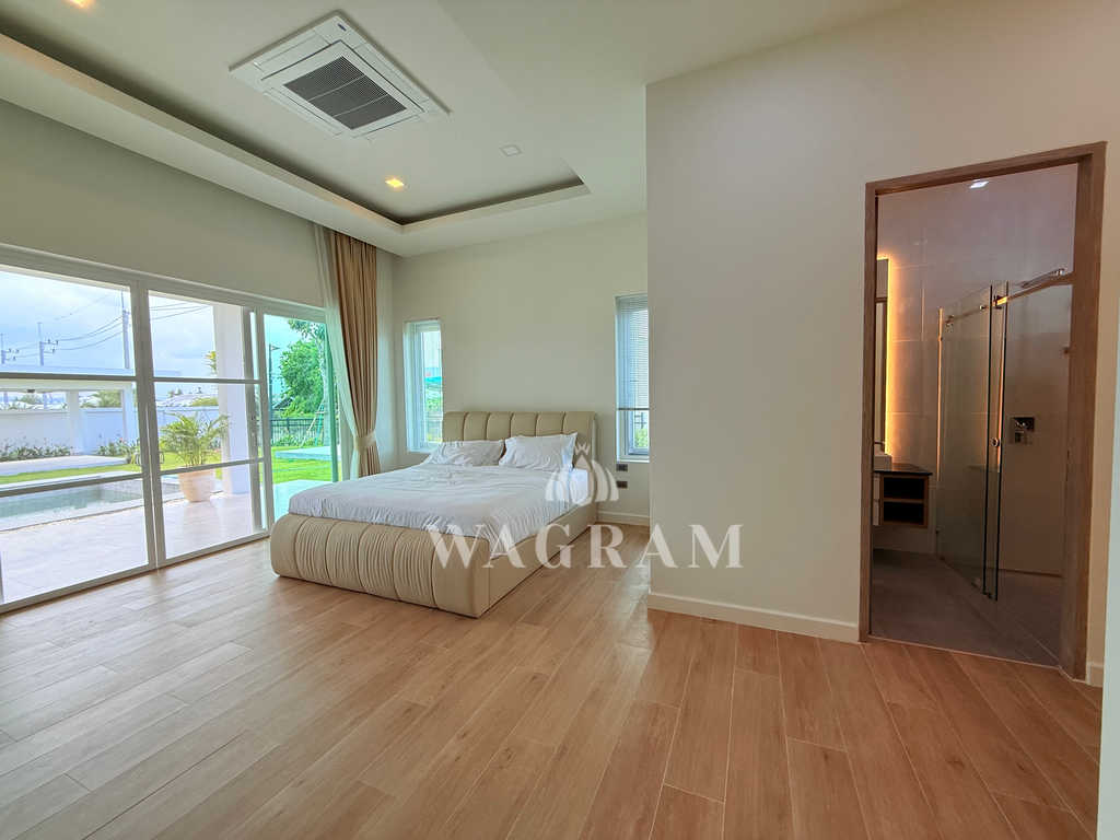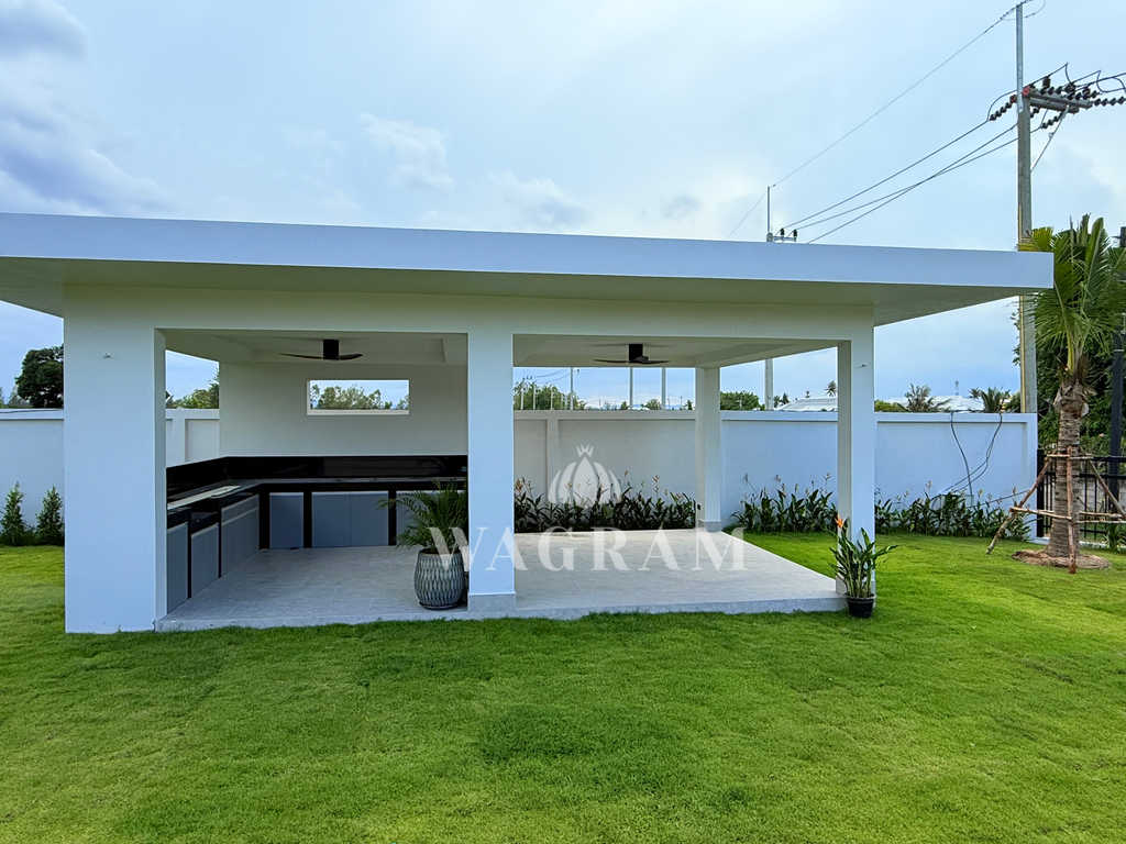 Pool villa OFF-plan and under construction Nestled amidst serene surroundings, this newly constructed villa in Hua Hin offers a peaceful and serene environment, enveloped by mountains and lush nature. Its modern Muji-style design emphasizes simplicity and a clean aesthetic, creating a tranquil atmosphere.spacious lounge areas and a fully fitted European-style kitchen.