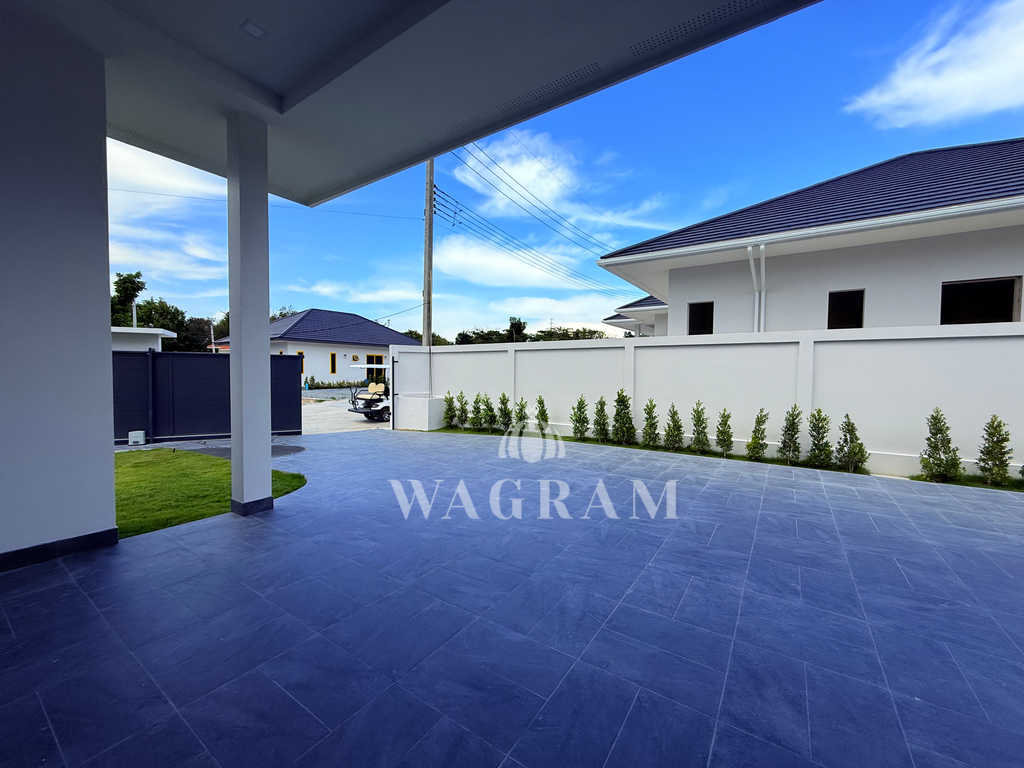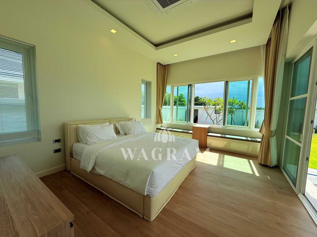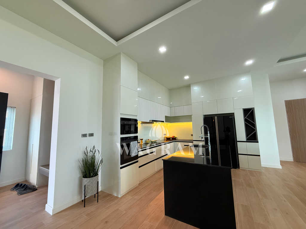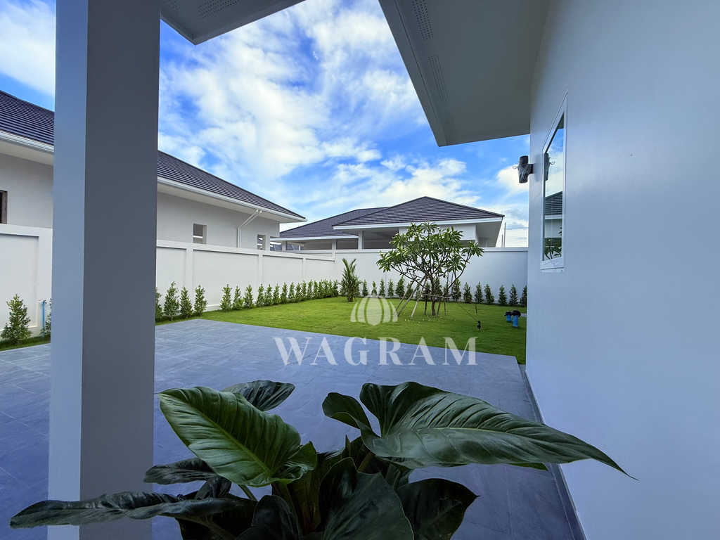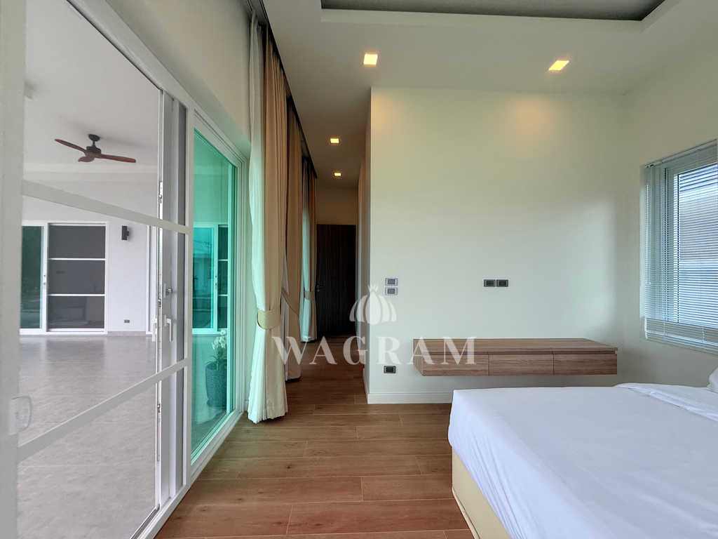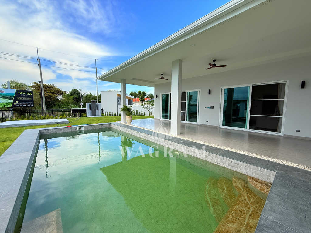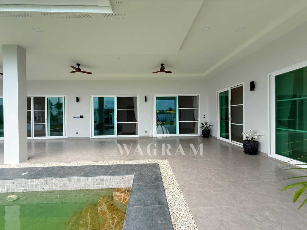 Pool villa OFF-plan and under construction Nestled amidst serene surroundings, this newly constructed villa in Hua Hin offers a peaceful and serene environment, enveloped by mountains and lush nature. Its modern Muji-style design emphasizes simplicity and a clean aesthetic, creating a tranquil atmosphere.spacious lounge areas and a fully fitted European-style kitchen.