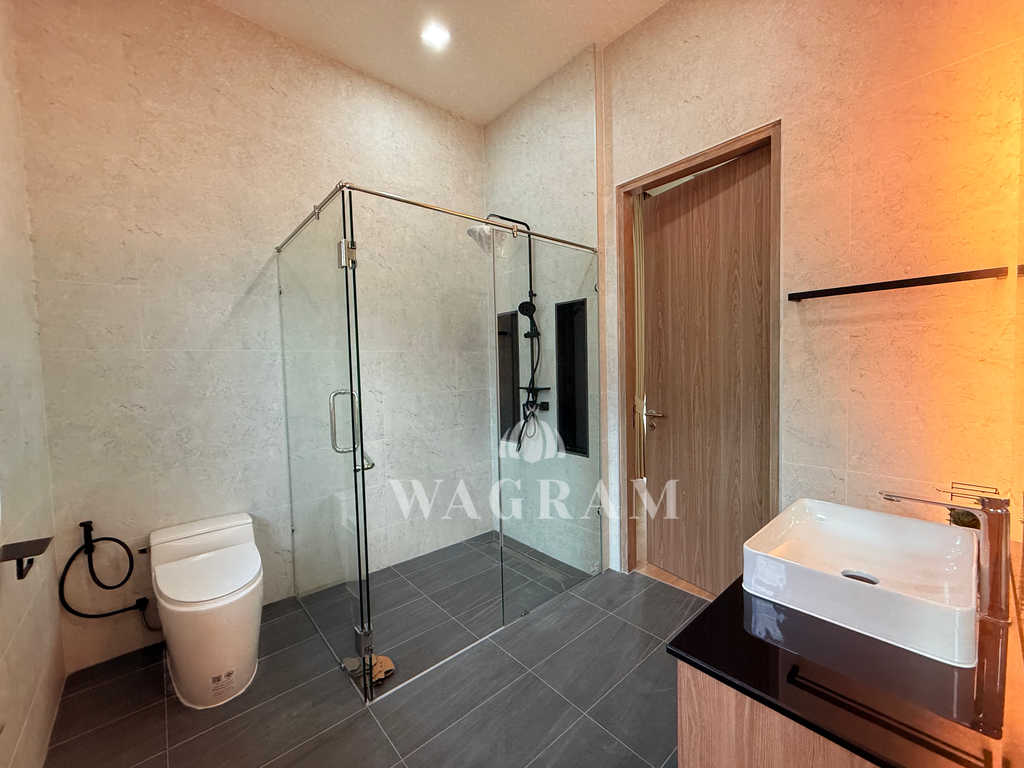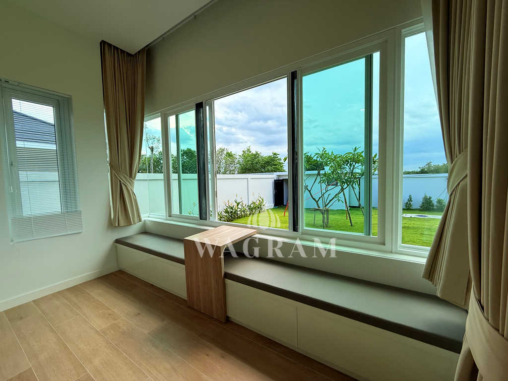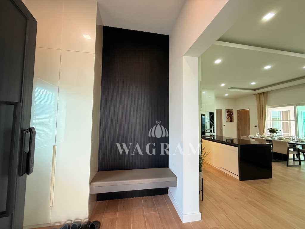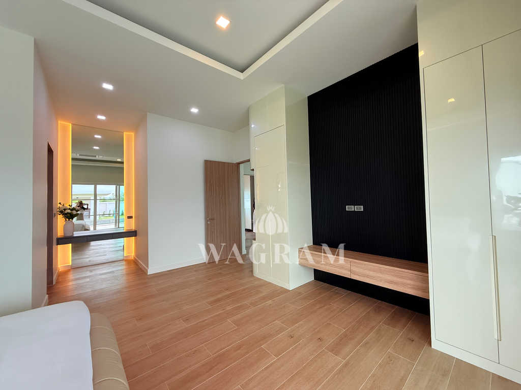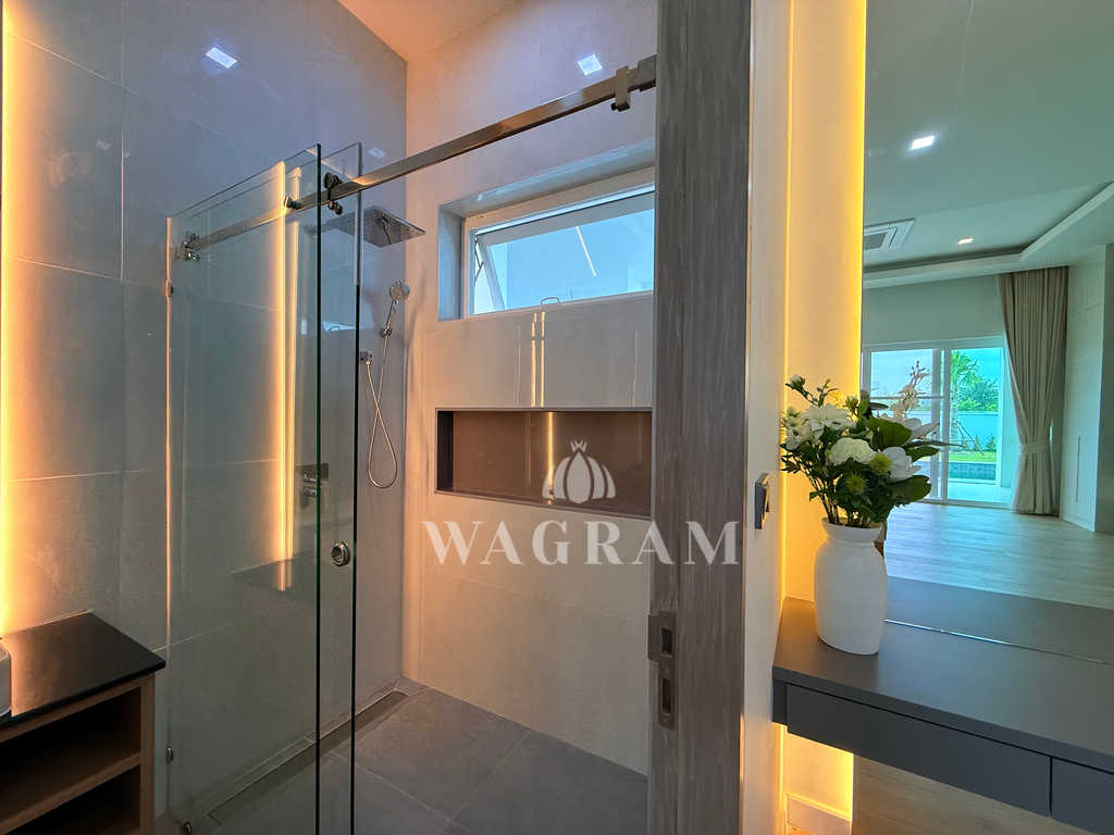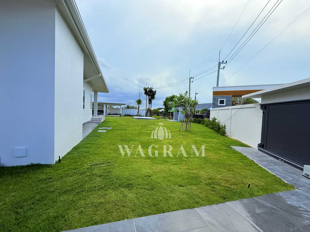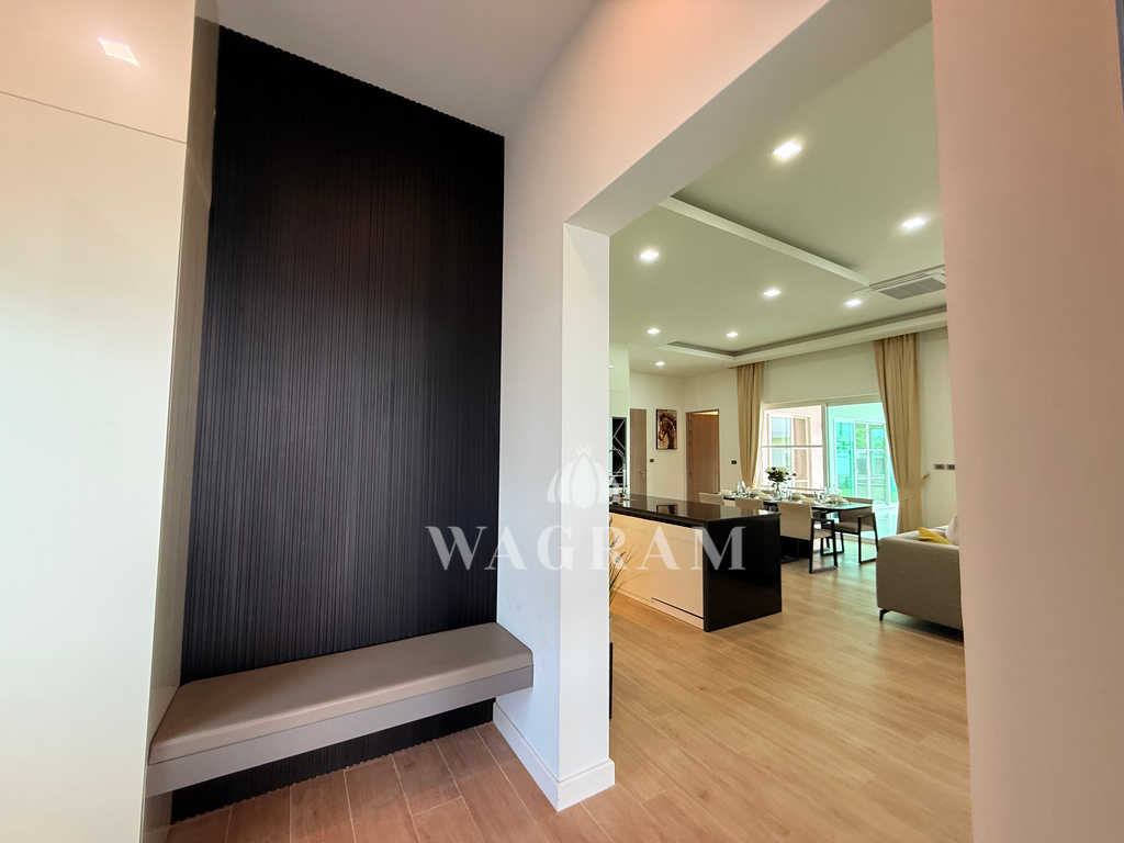 Pool villa OFF-plan and under construction Nestled amidst serene surroundings, this newly constructed villa in Hua Hin offers a peaceful and serene environment, enveloped by mountains and lush nature. Its modern Muji-style design emphasizes simplicity and a clean aesthetic, creating a tranquil atmosphere.spacious lounge areas and a fully fitted European-style kitchen.