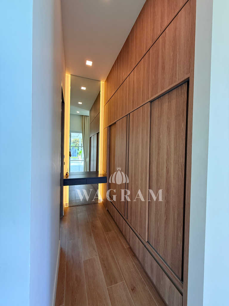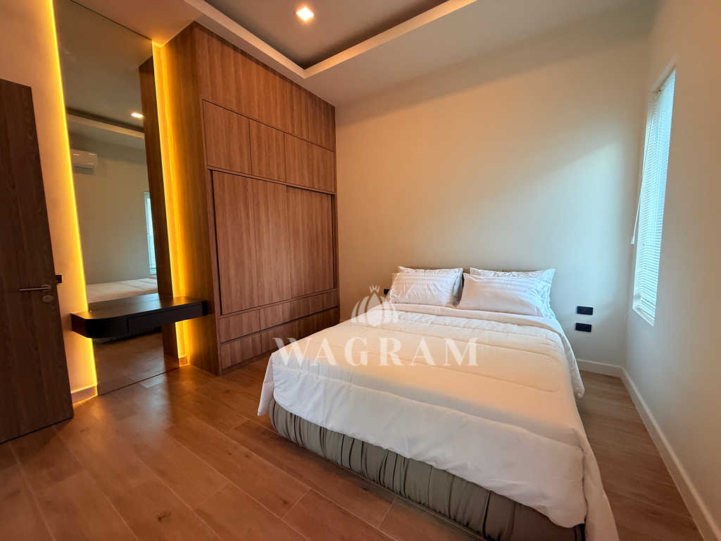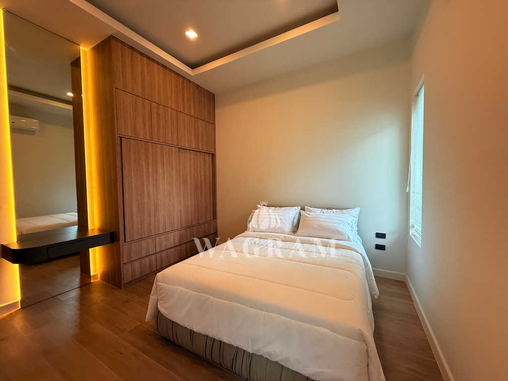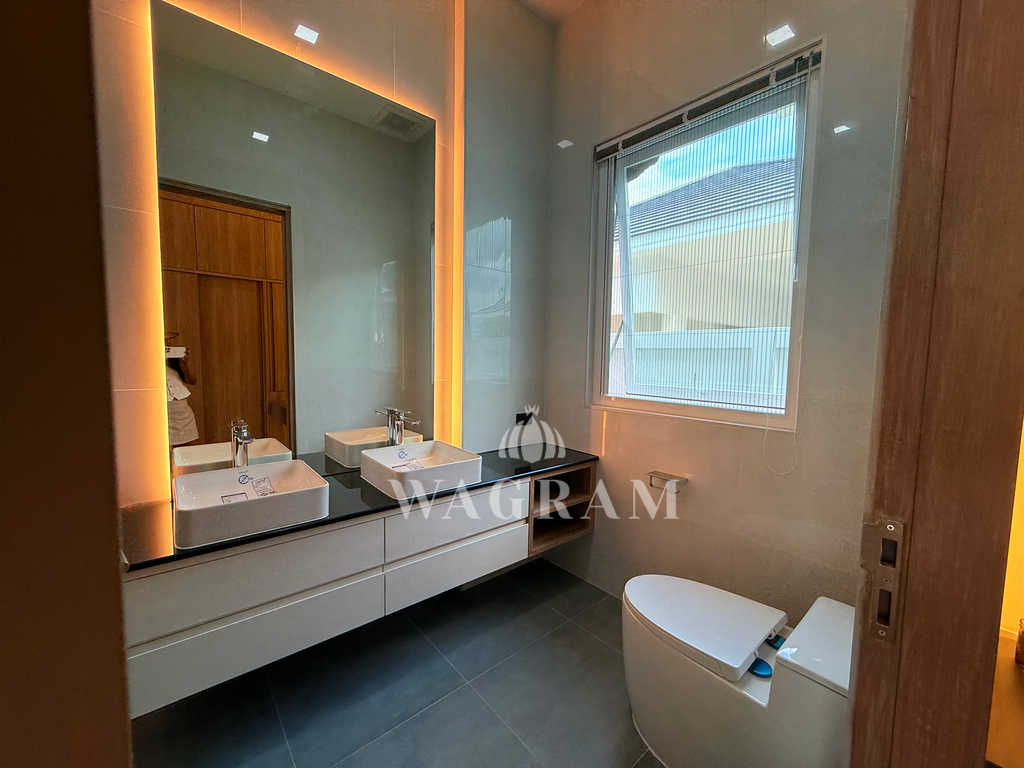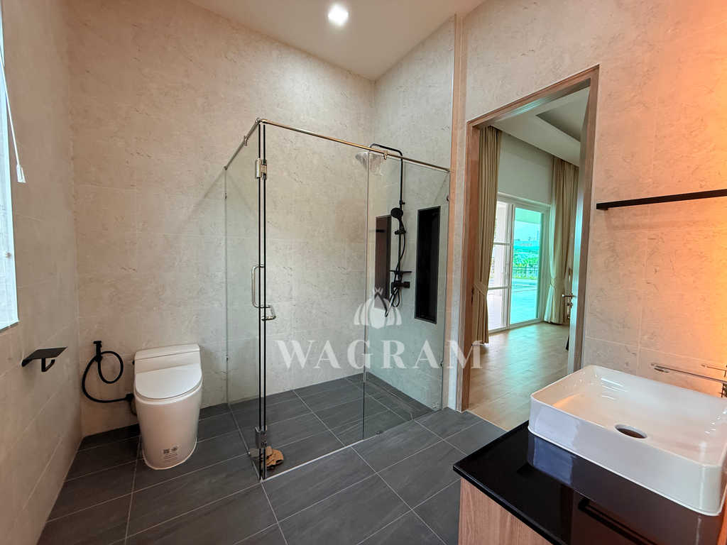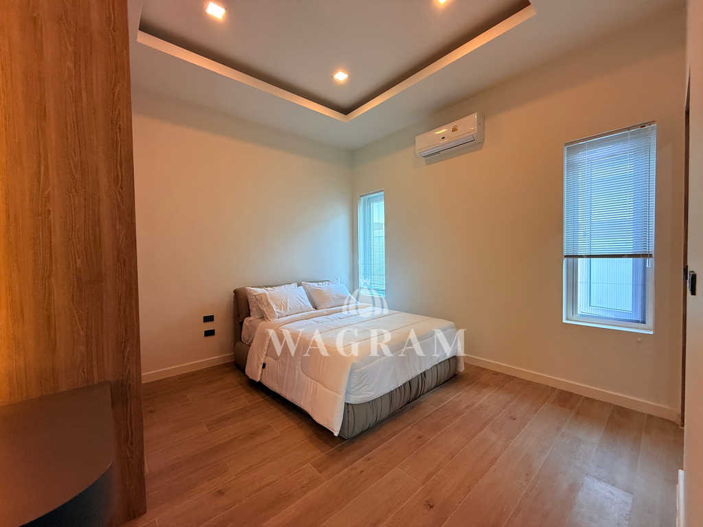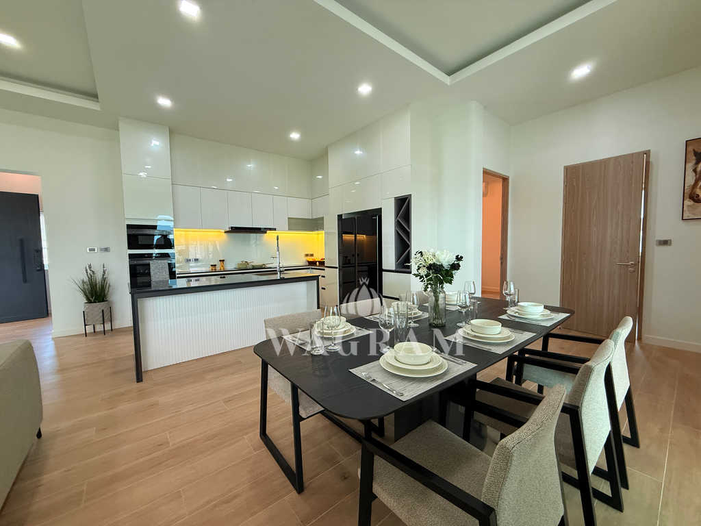 Pool villa OFF-plan and under construction Nestled amidst serene surroundings, this newly constructed villa in Hua Hin offers a peaceful and serene environment, enveloped by mountains and lush nature. Its modern Muji-style design emphasizes simplicity and a clean aesthetic, creating a tranquil atmosphere.spacious lounge areas and a fully fitted European-style kitchen.