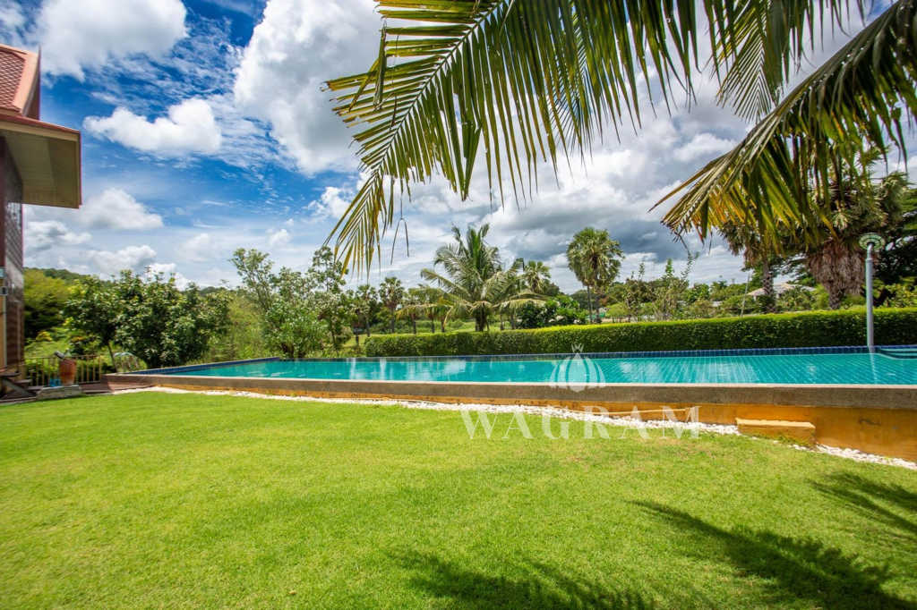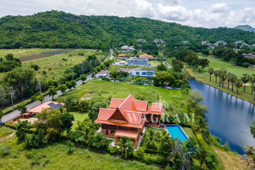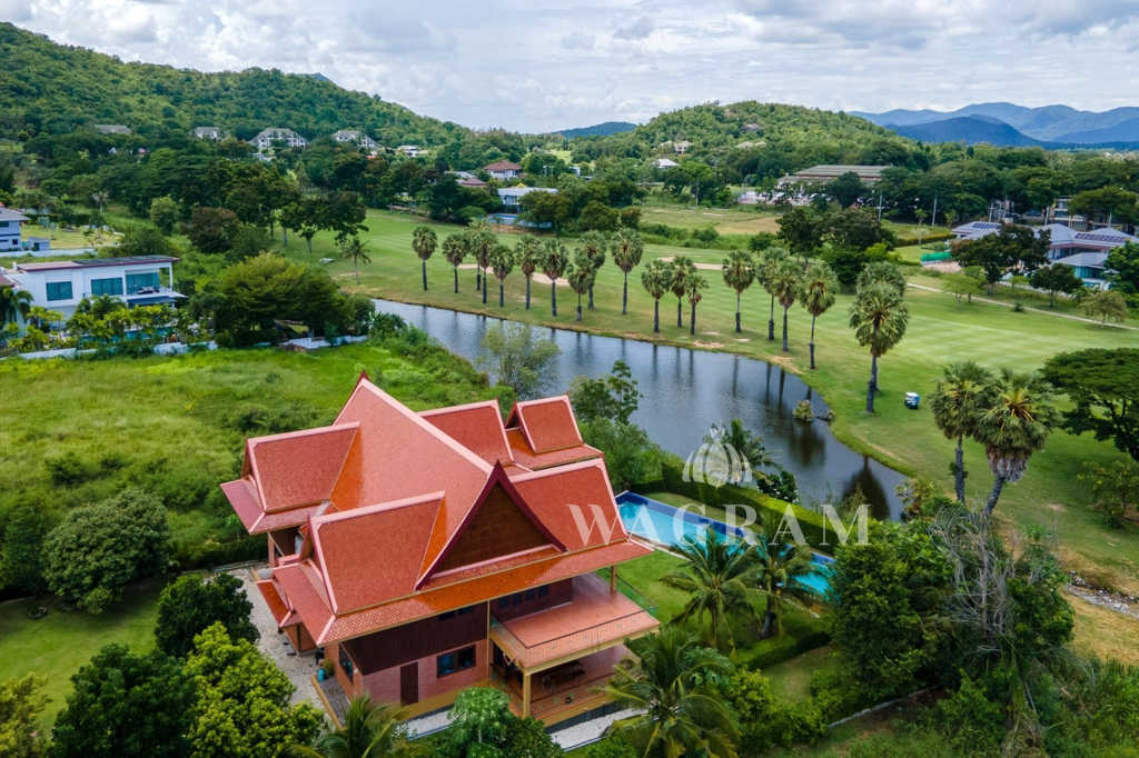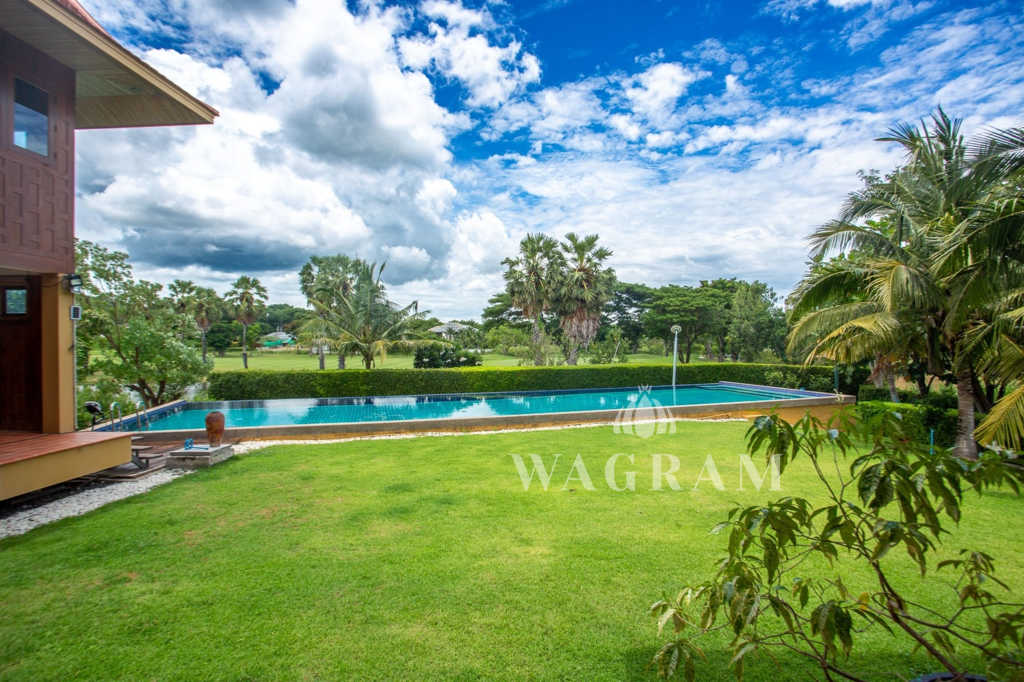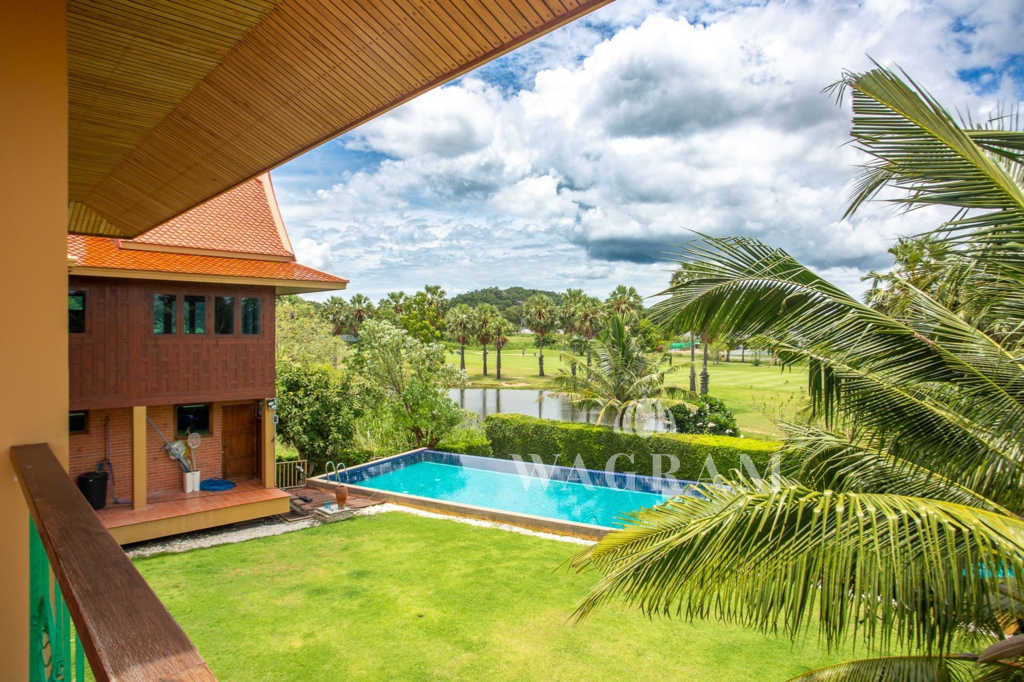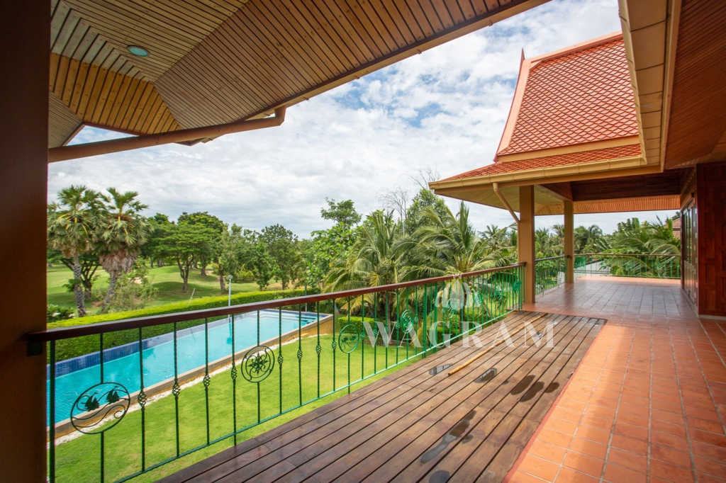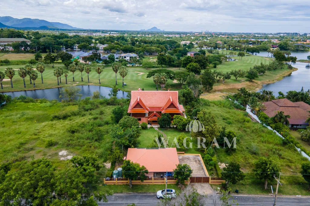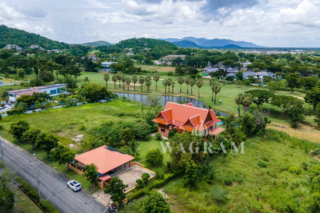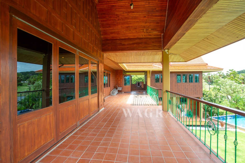 This stunning two-story Ayutthaya-style Thai house, built entirely from teak and hardwood, offers exceptional durability and charm. Nestled within a renowned, quiet, and peaceful golf course, the property spans 1.5 rai (2,400 square meters) with breathtaking views of a nearby lake and surrounding mountains. This serene retreat features 4 spacious bedrooms, 4 bathrooms, a dedicated office, and 2 storage rooms, providing a perfect blend of traditional elegance and modern comfort in a tranquil, picturesque setting.