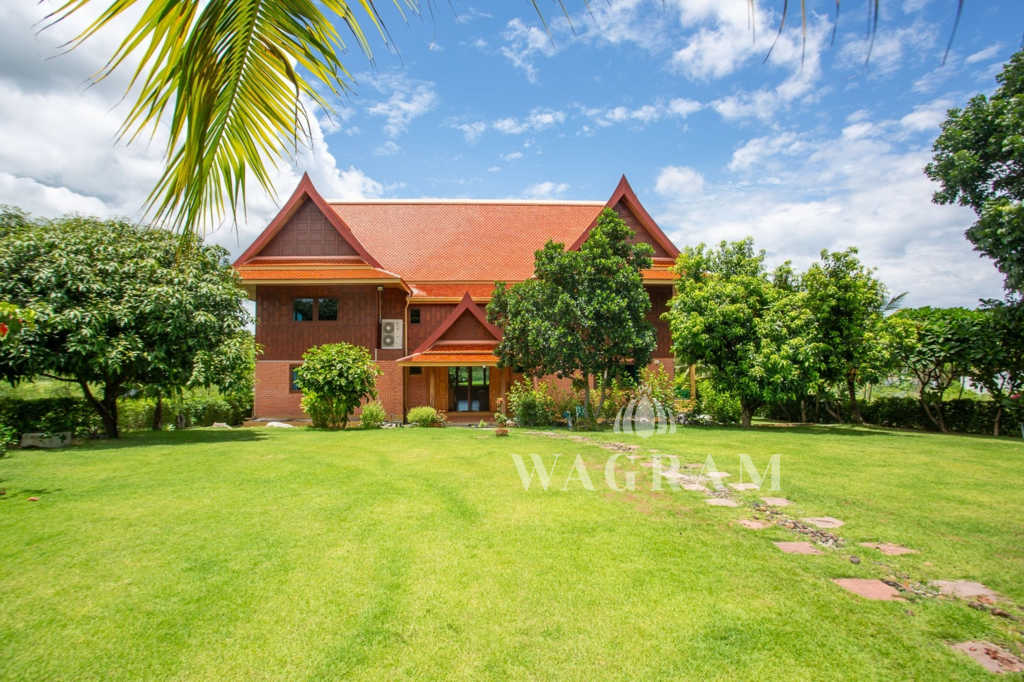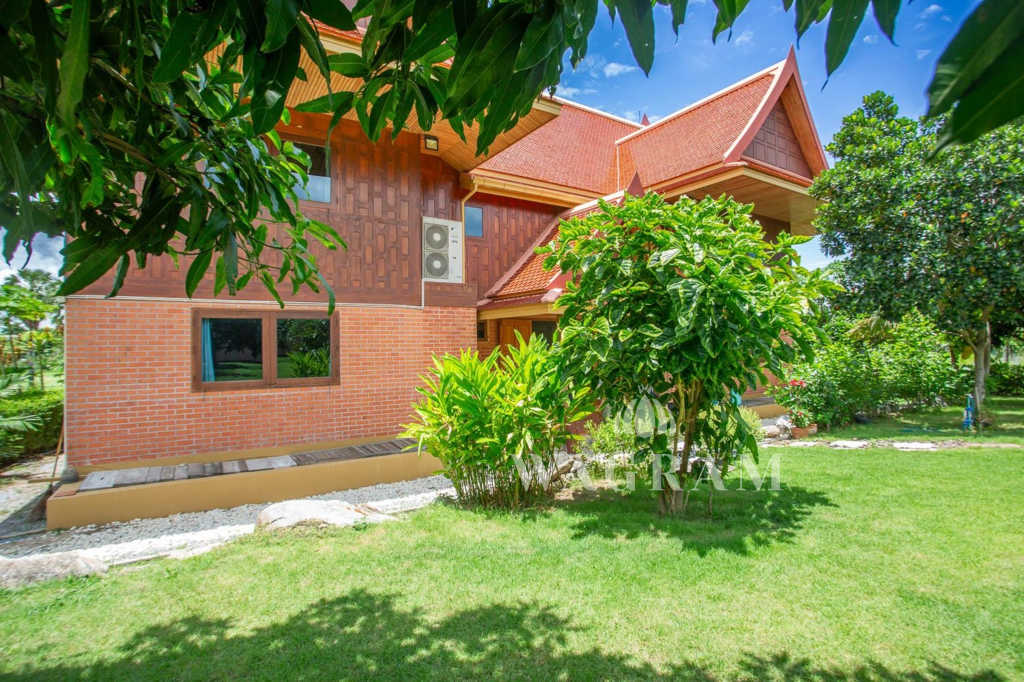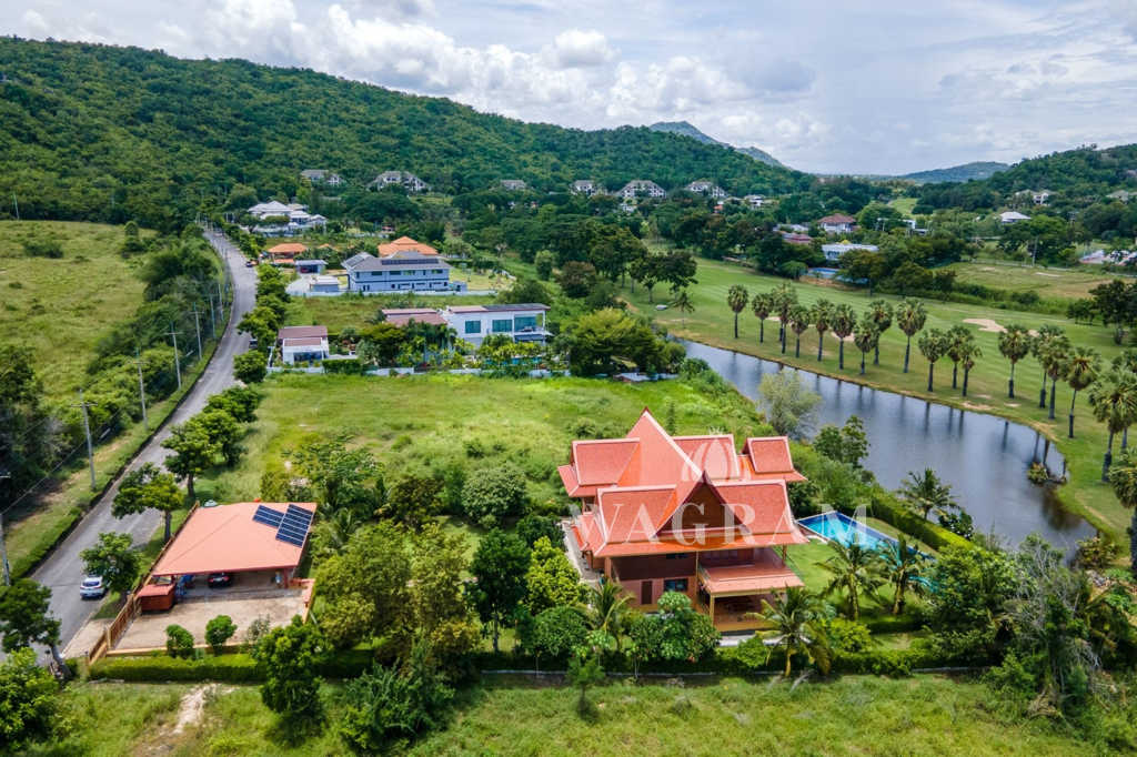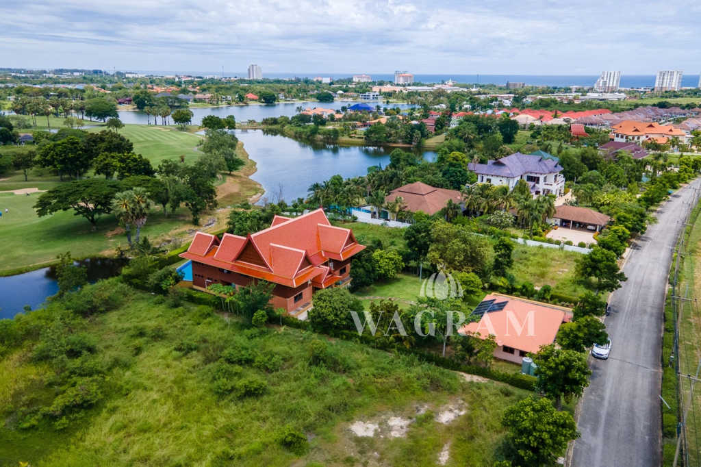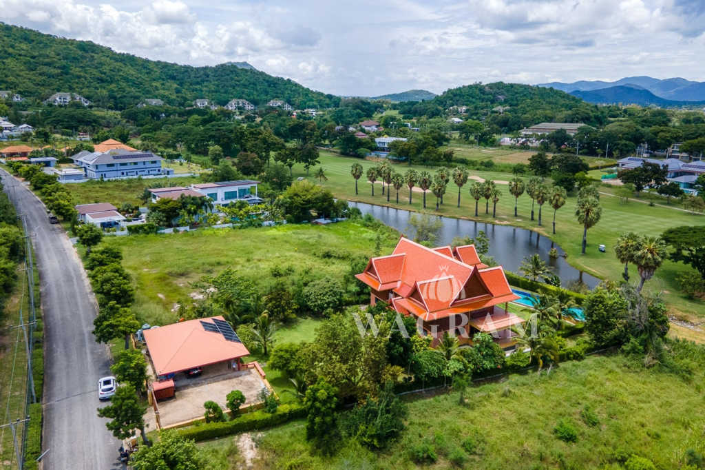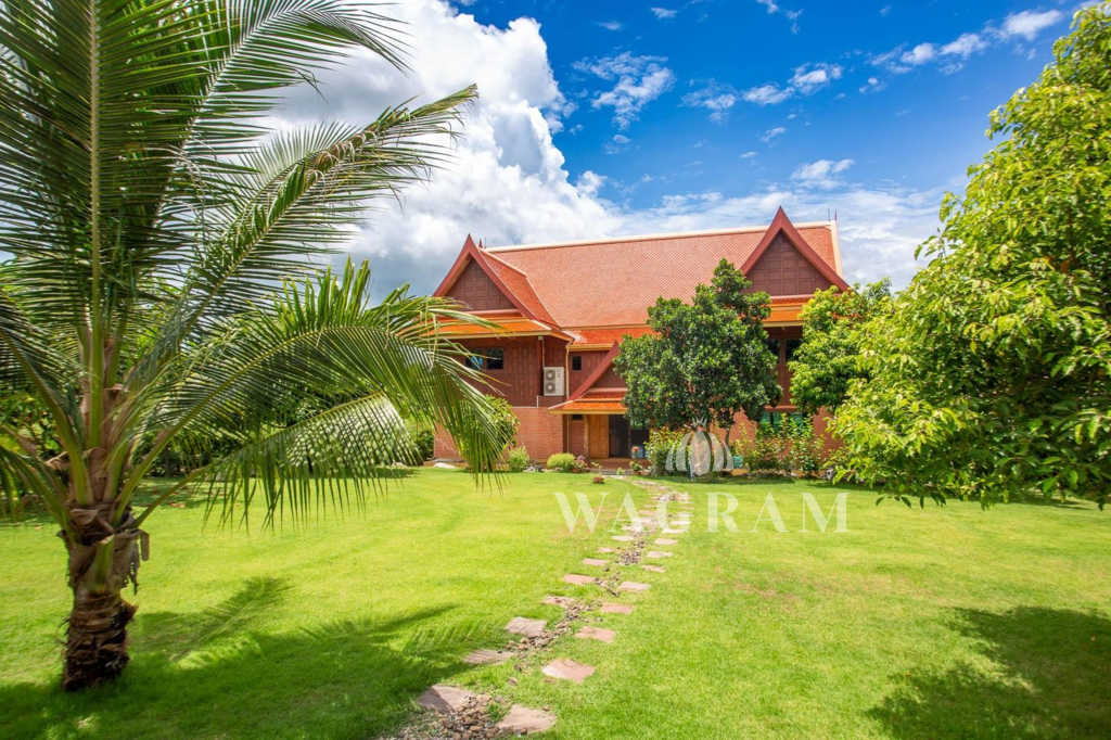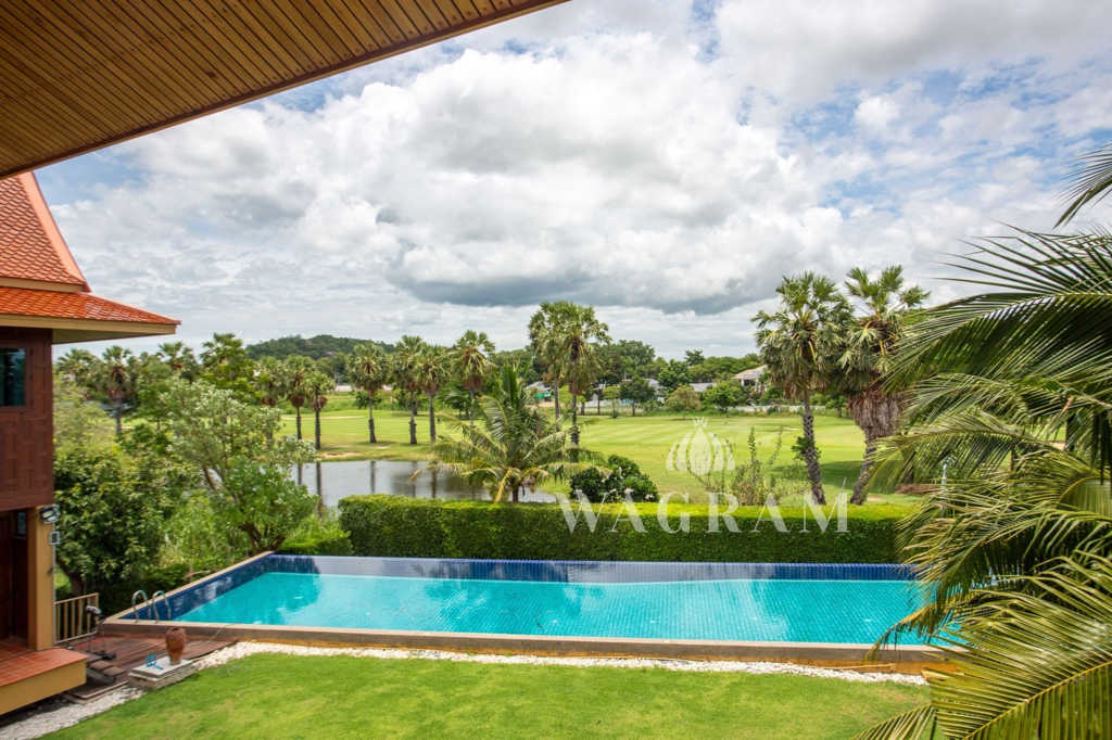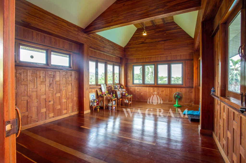 This stunning two-story Ayutthaya-style Thai house, built entirely from teak and hardwood, offers exceptional durability and charm. Nestled within a renowned, quiet, and peaceful golf course, the property spans 1.5 rai (2,400 square meters) with breathtaking views of a nearby lake and surrounding mountains. This serene retreat features 4 spacious bedrooms, 4 bathrooms, a dedicated office, and 2 storage rooms, providing a perfect blend of traditional elegance and modern comfort in a tranquil, picturesque setting.