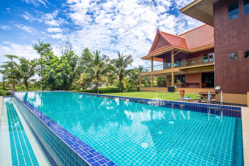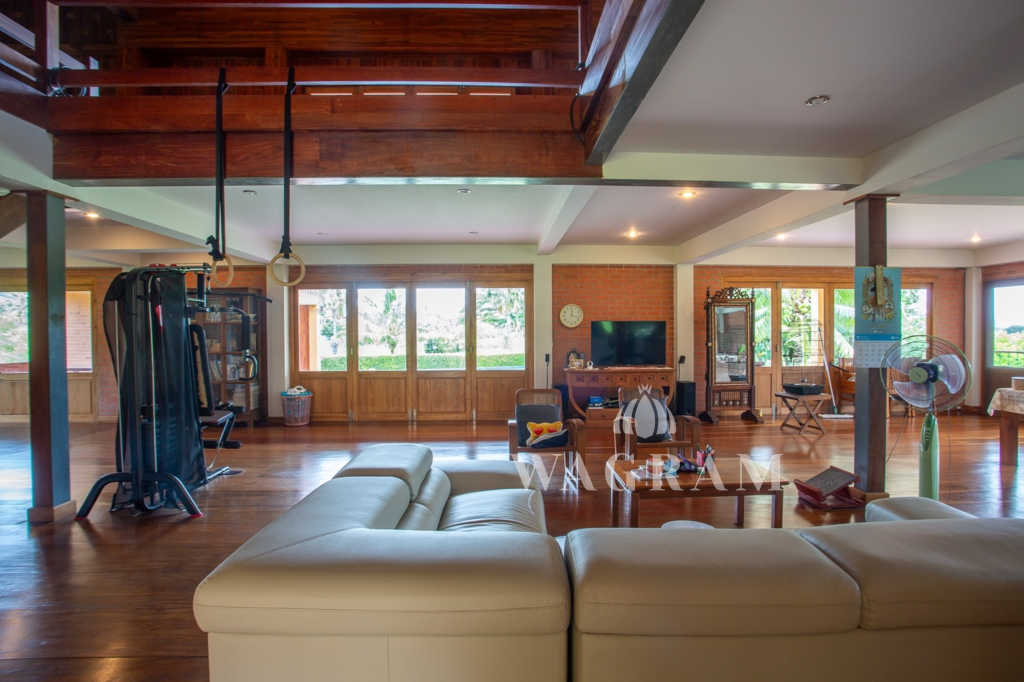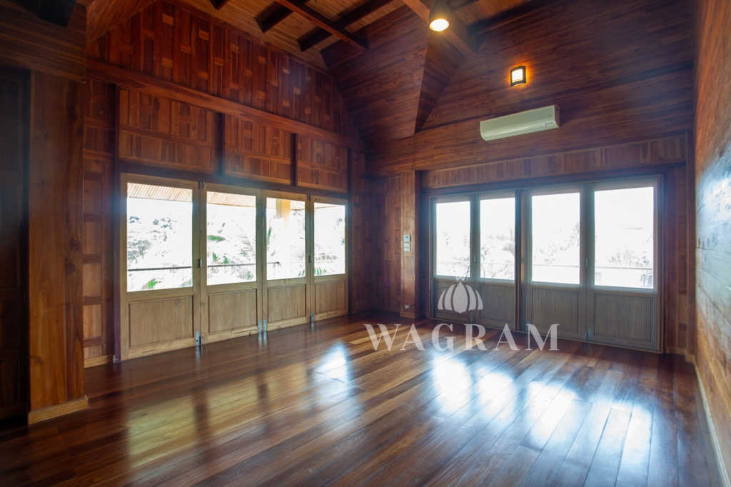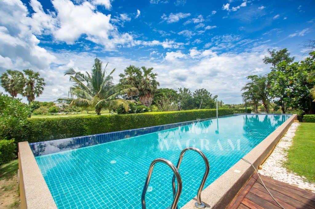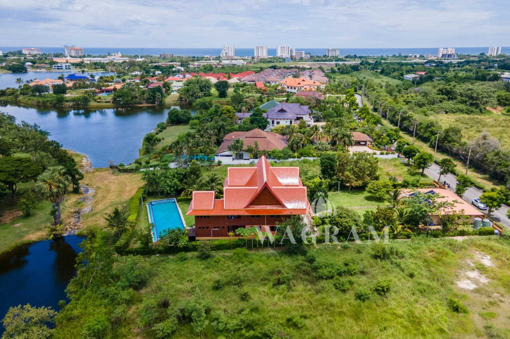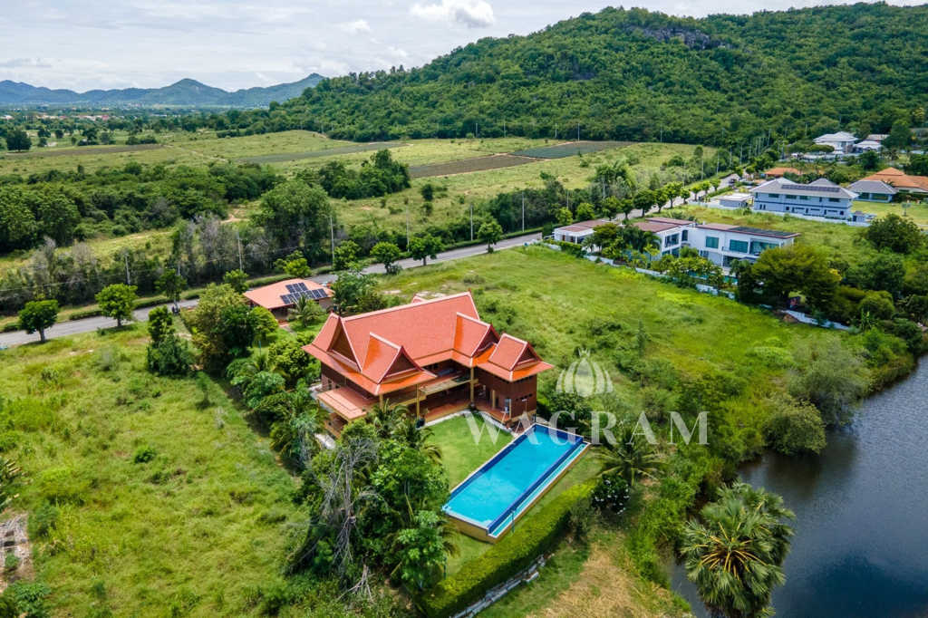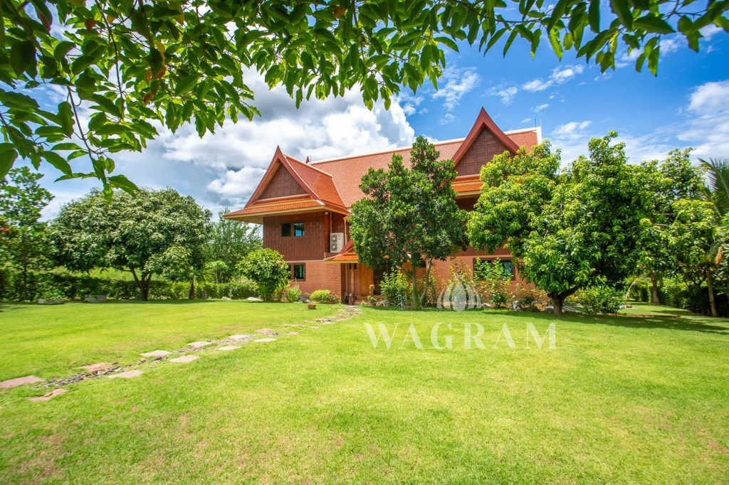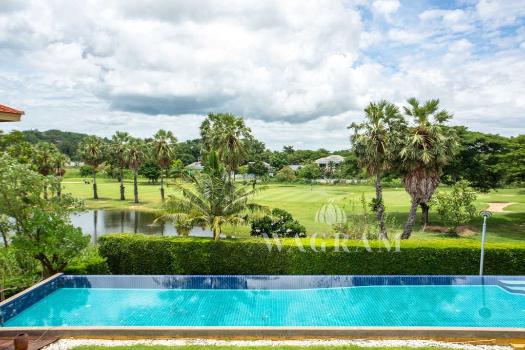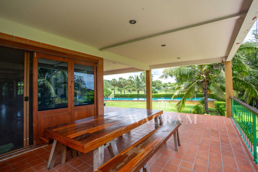 This stunning two-story Ayutthaya-style Thai house, built entirely from teak and hardwood, offers exceptional durability and charm. Nestled within a renowned, quiet, and peaceful golf course, the property spans 1.5 rai (2,400 square meters) with breathtaking views of a nearby lake and surrounding mountains. This serene retreat features 4 spacious bedrooms, 4 bathrooms, a dedicated office, and 2 storage rooms, providing a perfect blend of traditional elegance and modern comfort in a tranquil, picturesque setting.