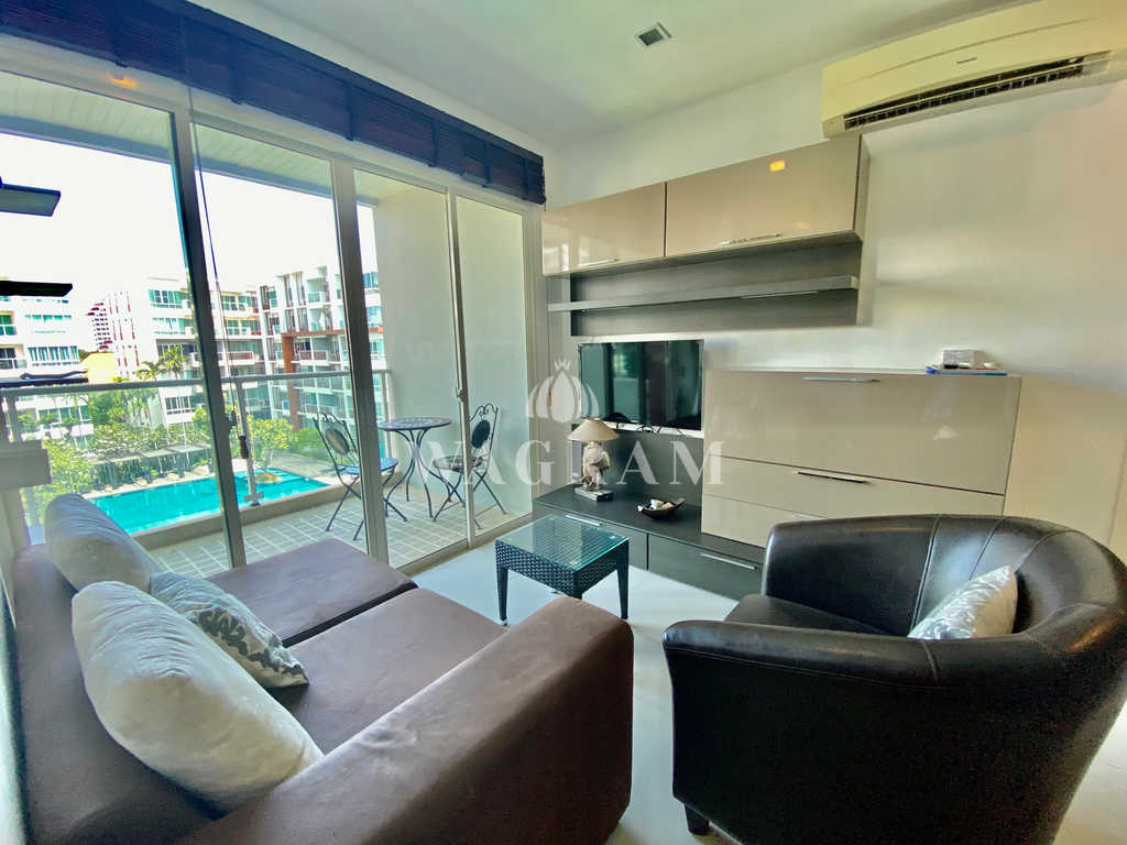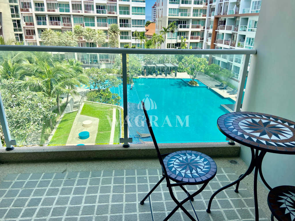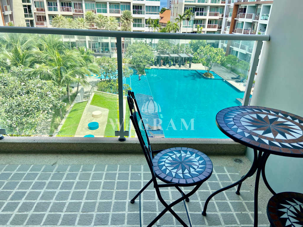 The condo features an open-plan living/dining room with access to a furnished balcony with pool view.